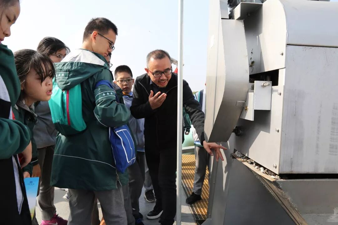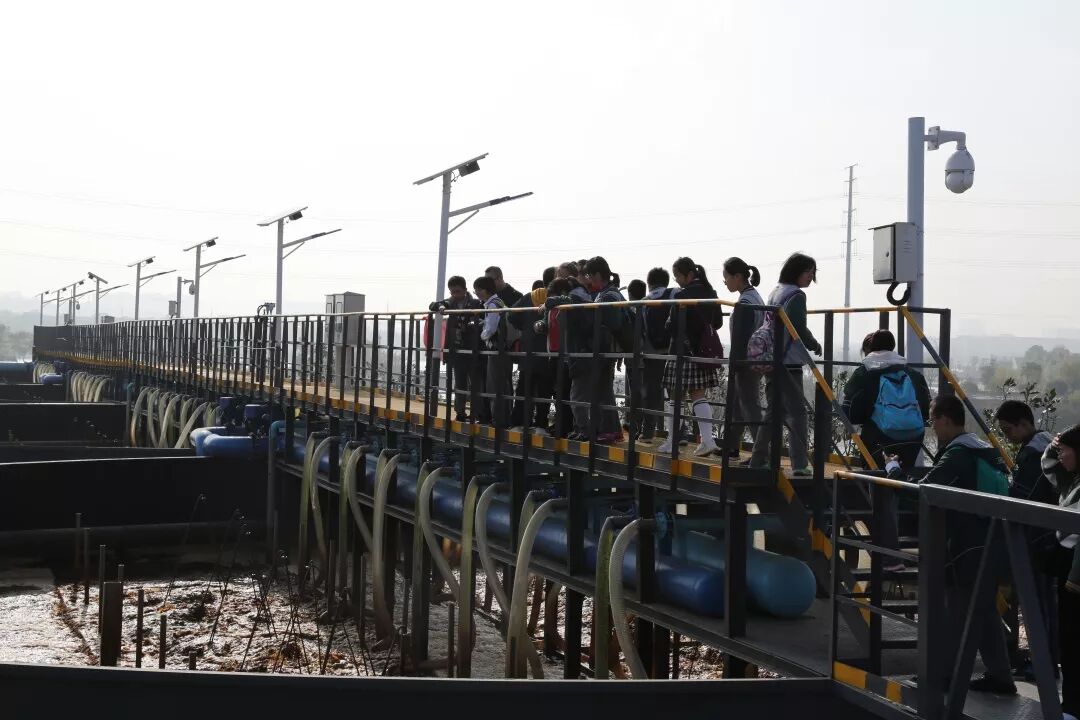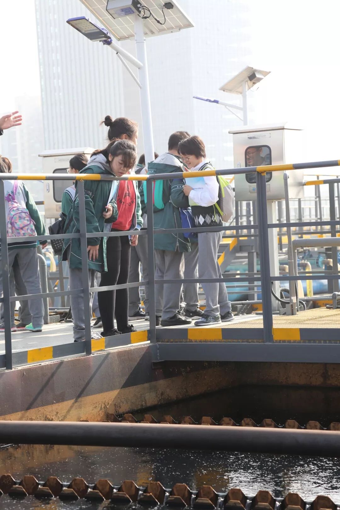 在处理污水规模为6万吨/天的南京分布式智慧水体净化岛现场,工程师们向同学们讲解了“悬浮床”、“三相增强”生物膜反应器、污水模块化装置(CBS)等核心环保技术。从散发恶臭的污水池到翻滚的生物膜反应处理池,再到清澈见底的出水展示池,让同学们大为惊叹。在身临其境的感受和聆听中,同学们的疑问也得到了解答。高科技的运用,让我们生活的城市天更蓝了,水更清了。